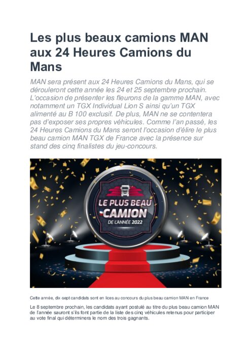 MAN sera présent aux 24 Heures Camions du Mans, qui se dérouleront cette année les 24 et 25 septembre prochain. L’occasion de présenter les fleurons de la gamme MAN, avec notamment un TGX Individual Lion S ainsi qu’un TGX alimenté au B 100 exclusif. De plus, MAN ne se contentera pas d’exposer ses propres véhicules. Comme l’an passé, les 24 Heures Camions du Mans seront l’occasion d’élire le plus