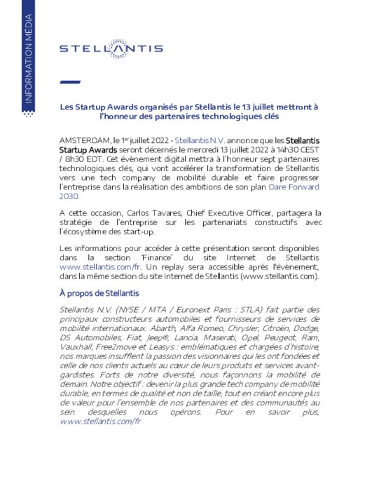 Stellantis N.V. annonce que les Stellantis Startup Awards seront décernés le mercredi 13 juillet 2022 à 14h30 CEST / 8h30 EDT. Cet évènement digital mettra à l’honneur sept partenaires technologiques clés, qui vont accélérer la transformation de Stellantis vers une tech company de mobilité durable et faire progresser l’entreprise dans la réalisation des ambitions de son plan Dare Forward 2030.