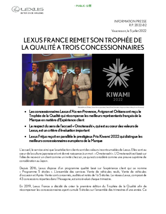 Les concessionnaires Lexus d’Aix-en-Provence, Avignon et Orléans ont reçu le Trophée de la Qualité qui récompense les meilleurs représentants français de la Marque en matière d’Expérience client. Le respect du sens de l’accueil « Omotenashi », qui est au cœur des valeurs de Lexus, est un critère d’évaluation important. Lexus Fréjus reçoit en parallèle le prestigieux Prix Kiwami 2022 qui distingue les meilleurs concessionnaires européens de la marque.