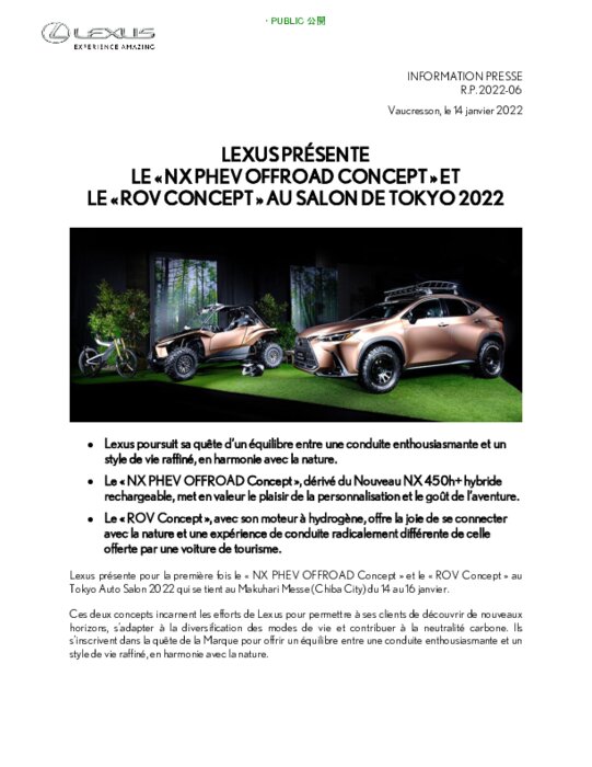 Lexus présente pour la première fois le « NX PHEV OFFROAD Concept » et le « ROV Concept » au Tokyo Auto Salon 2022 qui se tient au Makuhari Messe (Chiba City) du 14 au 16 janvier. Ces deux concepts incarnent les efforts de Lexus pour permettre à ses clients de découvrir de nouveaux horizons, s’adapter à la diversification des modes de vie et contribuer à la neutralité carbone. Ils s’inscrivent dans la quête de la Marque pour offrir un équilibre entre une conduite enthousiasmante...