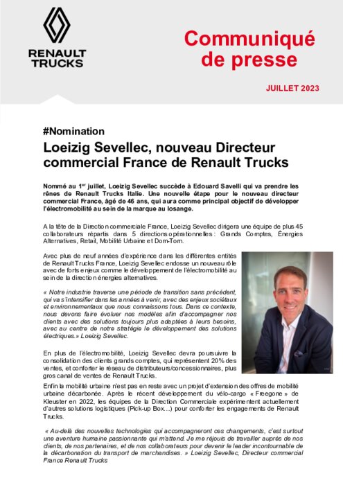 Nommé au 1er juillet, Loeizig Sevellec succède à Edouard Savelli qui va prendre les rênes de Renault Trucks Italie. Une nouvelle étape pour le nouveau directeur commercial France, âgé de 46 ans, qui aura comme principal objectif de développer l’électromobilité au sein de la marque au losange.