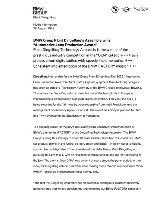 Le prix 2022 "Automotive Lean Production Award" 2022 dans la catégorie "OEM" (Original Equipment Manufacturer) a été décerné à l'assemblage technologique sur le site du groupe BMW en Basse-Bavière. L'usine d'assemblage de véhicules de Dingolfing est ainsi l'une des meilleures usines d'Europe en matière de mise en œuvre de la production allégée parallèlement à l'innovation numérique.