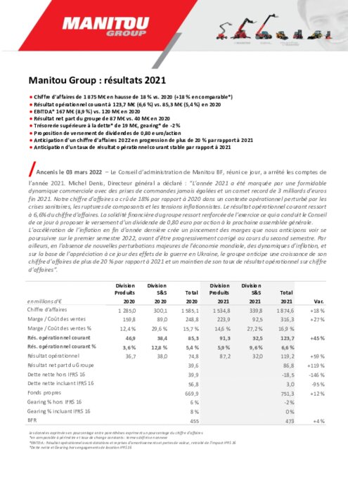 Le Conseil d’administration de Manitou BF, réuni ce jour, a arrêté les comptes de l’année 2021. Michel Denis, Directeur général a déclaré : “L’année 2021 a été marquée par une formidable dynamique commerciale avec des prises de commandes jamais égalées et un carnet record de 3 milliards d’euros fin 2021. Notre chiffre d’affaires a crû de 18% par rapport à 2020 dans un contexte opérationnel perurbé par les crises sanitaires, les ruptures de composants et les tensions inflationnistes...