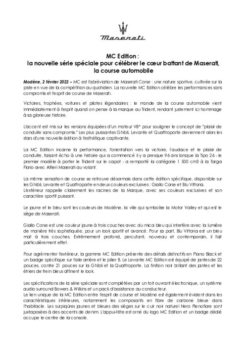 MC est l'abréviation de Maserati Corse : une nature sportive, cultivée sur la piste en vue de la compétition au quotidien. La nouvelle MC Edition célèbre les performances sans compromis et l'esprit de course de Maserati.