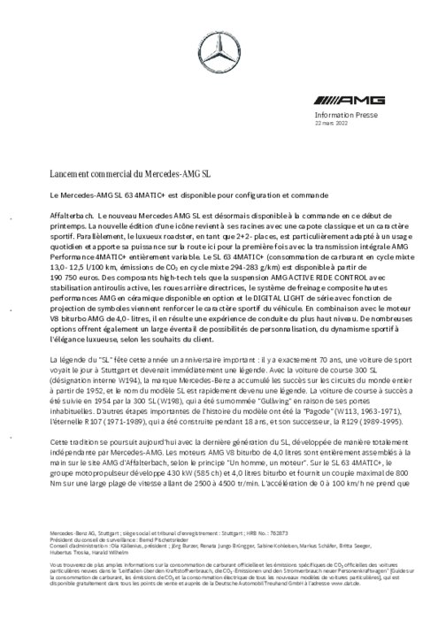 Le nouveau Mercedes AMG SL est désormais disponible à la commande en ce début de printemps. La nouvelle édition d'une icône revient à ses racines avec une capote classique et un caractère sportif. Parallèlement, le luxueux roadster, en tant que 2+2- places, est particulièrement adapté à un usage quotidien et apporte sa puissance sur la route ici pour la première fois avec la transmission intégrale AMG Performance 4MATIC+ entièrement variable...