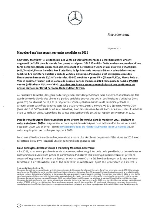 Les ventes d’utilitaires Mercedes-Benz (hors genre VP) ont augmenté de 2,6% dans le monde l’an passé, atteignant 334 210 unités. Cette croissance provient d’une forte demande globale au premier semestre 2021 et de ventes en Chine et aux USA très dynamiques (+11,3% et +4,8% sur l’année). Aux États-Unis, le Sprinter a de nouveau été un « sales driver » et au total, 53 472 Sprinter et Metris y ont été vendus. En Europe, l’Espagne s’est distinguée avec des livraisons en hausse de 23,2% l’an dernier.