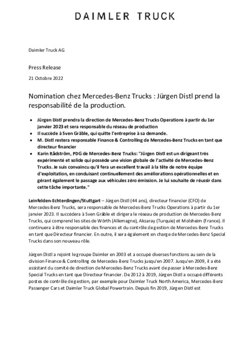 Jürgen Distl (44 ans), directeur financier (CFO) de Mercedes-Benz Trucks, sera responsable de Mercedes-Benz Trucks Operations à partir du 1er janvier 2023. Il succédera à Sven Gräble et dirigera le réseau de production de Mercedes-Benz Trucks, qui comprend les sites de Wörth (Allemagne), Aksaray (Turquie) et Molsheim (France). Il continuera à être responsable des finances et du contrôle de gestion de Mercedes-Benz Trucks en tant que Directeur financier.