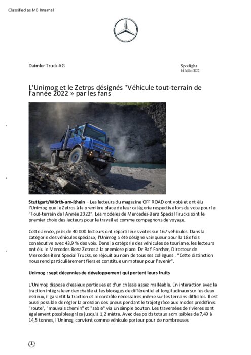 Les lecteurs du magazine OFF ROAD ont voté et ont élu l'Unimog que le Zetros à la première place de leur catégorie respective lors du vote pour le "Tout-terrain de l'Année 2022". Les modèles de Mercedes-Benz Special Trucks sont le premier choix des lecteurs pour le travail et comme compagnons de voyage.
