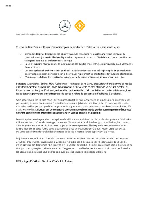 "En travaillant ensemble, (les deux groupes) seront en mesure de tirer parti des synergies opérationnelles et d'augmenter considérablement leur rentabilité pour aider à rendre les camionnettes plus abordables pour les clients commerciaux motivés par le coût total", souligne le communiqué.