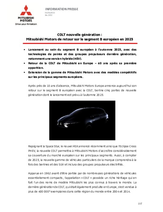 Après près de 10 ans d’absence, Mitsubishi Motors Europe annonce son retour sur le segment B européen avec la COLT, berline cinq portes de nouvelle génération dont le lancement est prévu à l’automne 2023. Rejoignant la Space Star, le nouvel ASX annoncé récemment ainsi que l’Eclipse Cross PHEV, la nouvelle COLT permettra à Mitsubishi Motors d’accroître considérablement sa couverture du marché européen sur les principaux segments...