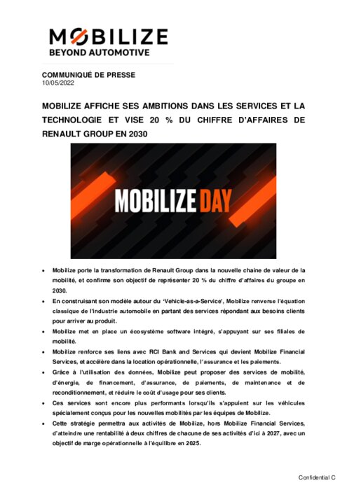 "Avec le modèle VaaS" (véhicule en tant que service) "et sur la base d'un écosystème logiciel intégré, nous proposons une gamme de services allant des solutions de financement à l'assurance, en passant par l'énergie et la maintenance. Le véhicule devient une plateforme de services, permettant de multiplier par trois le chiffre d'affaires généré au cours de son cycle de vie", a indiqué la directrice générale de Mobilize.