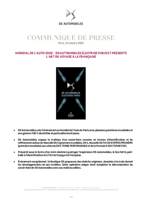 DS Automobiles crée l’évènement au Mondial de l’Auto de Paris avec plusieurs premières mondiales et une gamme 100 % électrifiée et particulièrement jeune. DS Automobiles expose la maîtrise d’un savoir-faire reconnu en termes d’électrification et de raffinement autour de Nouvelle DS 3 (première mondiale), DS 4, Nouvelle DS 7 et DS 9 OPÉRA PREMIÈRE (première mondiale) aux côtés de DS E-TENSE PERFORMANCE et de la Formule E DS E-TENSE FE21.