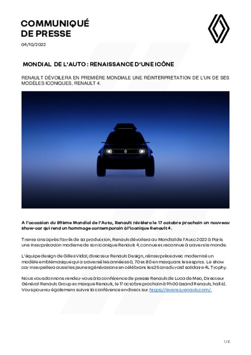 Constructeurs 04 octobre 2022 - 09:45 A l’occasion du 89ème Mondial de l’Auto, Renault révèlera le 17 octobre prochain un nouveau show-car qui rend un hommage contemporain à l’iconique Renault 4. PDF (370 Ko) Télécharger