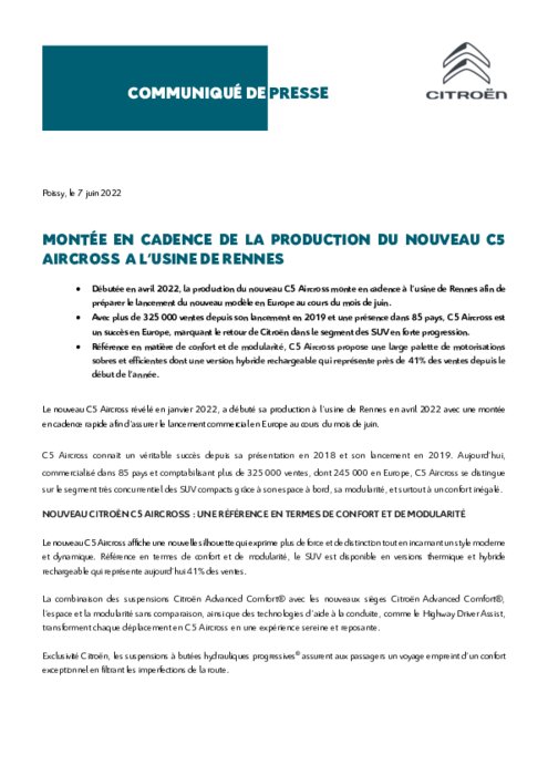 Le nouveau C5 Aircross révélé en janvier 2022, a débuté sa production à l’usine de Rennes en avril 2022 avec une montée en cadence rapide afin d’assurer le lancement commercial en Europe au cours du mois de juin. C5 Aircross connaît un véritable succès depuis sa présentation en 2018 et son lancement en 2019.