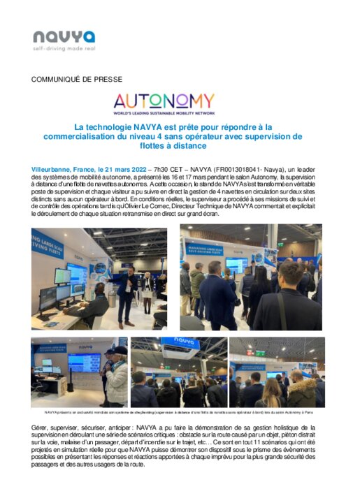 NAVYA, un leader des systèmes de mobilité autonome, a présenté les 16 et 17 mars pendant le salon Autonomy, la supervision à distance d’une flotte de navettes autonomes. A cette occasion, le stand de NAVYA s’est transformé en véritable poste de supervision et chaque visiteur a pu suivre en direct la gestion de 4 navettes en circulation sur deux sites distincts sans aucun opérateur à bord. En conditions réelles, le superviseur a procédé à ses missions de suivi et de contrôle...