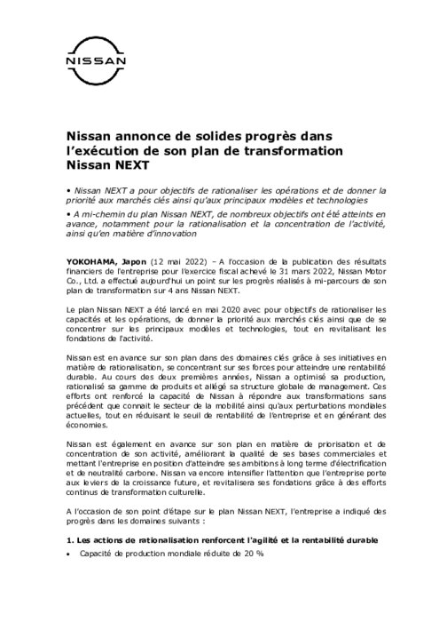 Nissan NEXT a pour objectifs de rationaliser les opérations et de donner la priorité aux marchés clés ainsi qu’aux principaux modèles et technologies. A mi-chemin du plan Nissan NEXT, de nombreux objectifs ont été atteints en avance, notamment pour la rationalisation et la concentration de l’activité, ainsi qu’en matière d’innovation.