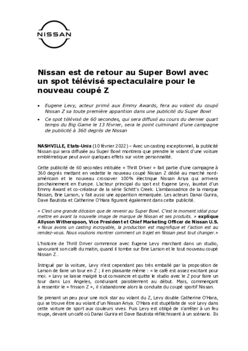 Avec un casting exceptionnel, la publicité Nissan qui sera diffusée au Super Bowl montrera que prendre le volant d'une voiture emblématique peut avoir quelques effets sur votre personnalité. Cette publicité de 60 secondes intitulée « Thrill Driver » fait partie d'une campagne à 360 degrés mettant en vedette le nouveau coupé Nissan Z dédié au marché nord-américain et le nouveau crossover 100% électrique Nissan Ariya qui arrivera prochainement en Europe...