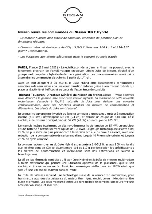 L'électrification de la gamme Nissan se poursuit avec le lancement prochain de l'emblématique crossover urbain Juke de Nissan, équipé d'un groupe motopropulseur hybride de dernière génération. Les concessionnaires seront prêts à prendre les commandes des clients à partir du 1er juin.
