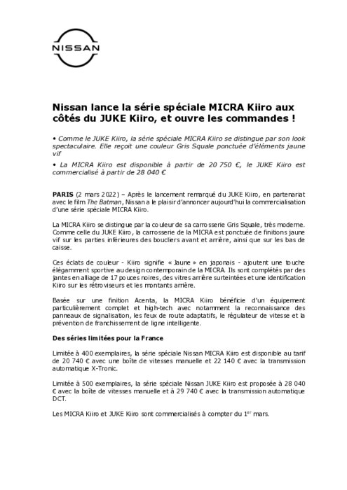 Après le lancement remarqué du JUKE Kiiro, en partenariat avec le film The Batman, Nissan a le plaisir d'annoncer la commercialisation d'une série spéciale MICRA Kiiro. La MICRA Kiiro se distingue par la couleur de sa carrosserie Gris Squale, très moderne. Comme celle du JUKE Kiiro, la carrosserie de la MICRA est ponctuée de finitions jaune vif sur les parties inférieures des boucliers avant et arrière, ainsi que sur les bas de caisse.