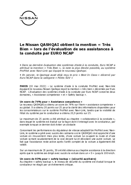 Dans sa dernière évaluation des systèmes d’aide à la conduite, Euro NCAP a attribué la mention « Très Bien », la note la plus élevée possible, au système ProPilot avec Navi-Link qui équipe le nouveau Qashqai. En janvier, le Qashqai avait déjà reçu le prix « Best In Class » décerné par Euro NCAP dans la catégorie « Petits SUV ».