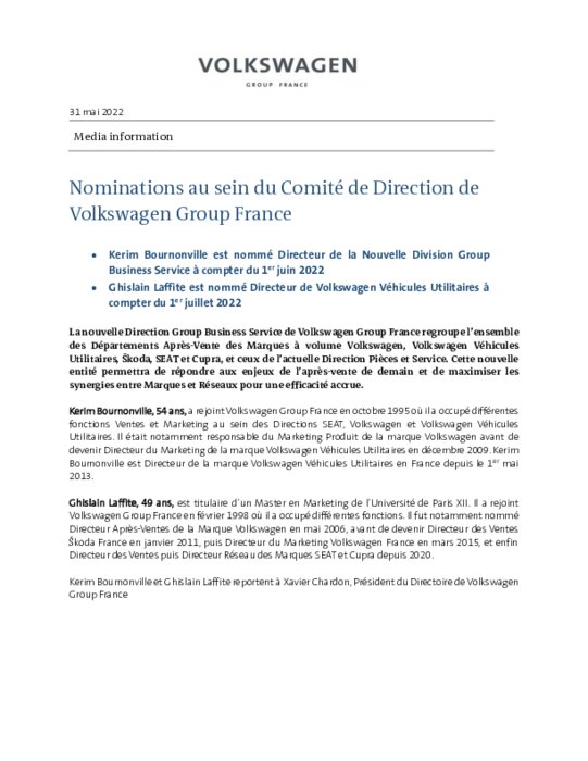 La nouvelle Direction Group Business Service de Volkswagen Group France regroupe l’ensemble des Départements Après-Vente des Marques à volume Volkswagen, Volkswagen Véhicules Utilitaires, Škoda, SEAT et Cupra, et ceux de l’actuelle Direction Pièces et Service. Cette nouvelle entité permettra de répondre aux enjeux de l’après-vente de demain et de maximiser les synergies entre Marques et Réseaux pour une efficacité accrue.