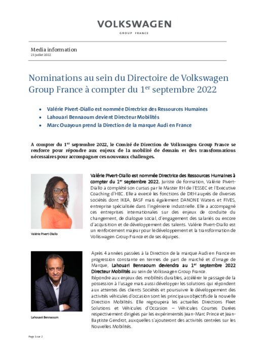 Valérie Pivert-Diallo est nommée Directrice des Ressources Humaines. Lahouari Bennaoum devient Directeur Mobilités. Marc Ouayoun prend la Direction de la marque Audi en France. A compter du 1er septembre 2022, le Comité de Direction de Volkswagen Group France se renforce pour répondre aux enjeux de la mobilité de demain et des transformations nécessaires pour accompagner ces nouveaux challenges.