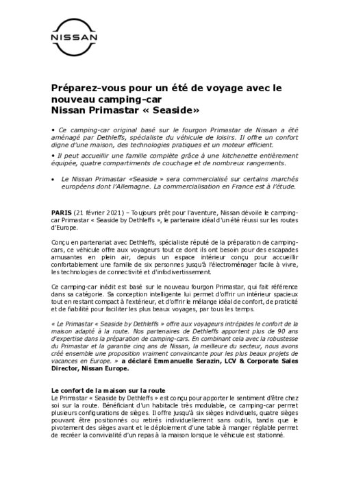 Toujours prêt pour l'aventure, Nissan dévoile le camping-car Primastar « Seaside by Dethleffs », le partenaire idéal d'un été réussi sur les routes d'Europe. Conçu en partenariat avec Dethleffs, spécialiste réputé de la préparation de camping-cars, ce véhicule offre aux voyageurs tout ce dont ils ont besoin pour des escapades amusantes en plein air, depuis un espace intérieur conçu pour accueillir confortablement une famille de six personnes jusqu'à l'électroménager facile à vivre...