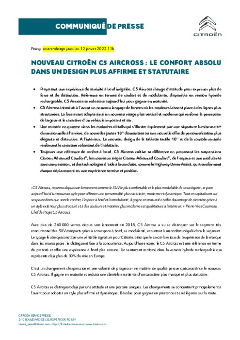 Avec plus de 260 000 ventes depuis son lancement en 2018, C5 Aircross a su se distinguer sur le segment très concurrentiel des SUV compacts grâce à son espace à bord, sa modularité, et surtout à un confort inégalé dans le segment. Le typage feutré qui constitue une véritable signature pour Citroën, ainsi que le savoir-faire issu de l’expérience de la marque dans les monospaces, le distinguent face à la concurrence...