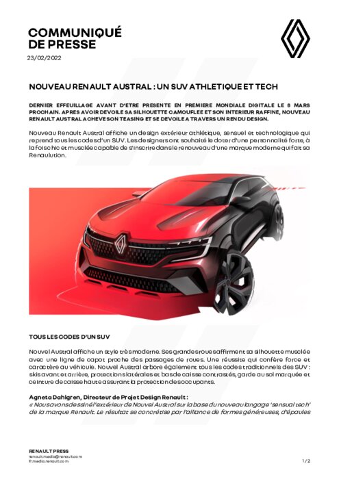 Nouveau Renault Austral affiche un design extérieur athlétique, sensuel et technologique qui reprend tous les codes d’un SUV. Les designers ont souhaité le doter d’une personnalité forte, à la fois chic et musclée capable de s’inscriredans le renouveau d’une marque moderne qui fait sa Renaulution.
