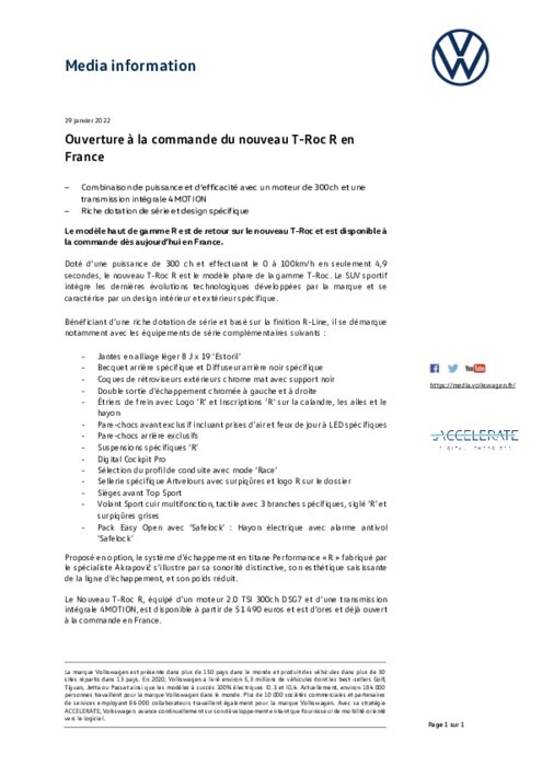 Doté d’une puissance de 300 ch et effectuant le 0 à 100km/h en seulement 4,9 secondes, le nouveau T-Roc R est le modèle phare de la gamme T-Roc. Le SUV sportif intègre les dernières évolutions technologiques développées par la marque et se caractérise par un design intérieur et extérieur spécifique. Le Nouveau T-Roc R, équipé d’un moteur 2.0 TSI 300ch DSG7 et d’une transmission intégrale 4MOTION, est disponible à partir de 51 490 euros et est d’ores et déjà ouvert à la commande en France.