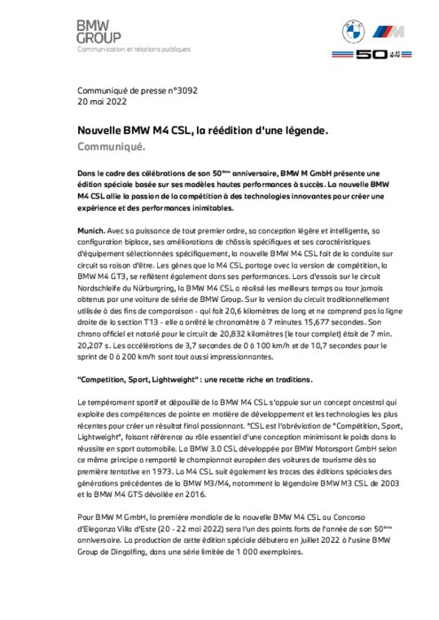 Dans le cadre des célébrations de son 50ème anniversaire, BMW M GmbH présente une édition spéciale basée sur ses modèles hautes performances à succès. La nouvelle BMW M4 CSL allie la passion de la compétition à des technologies innovantes pour créer une expérience et des performances inimitables.