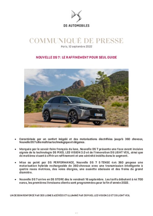 Caractérisée par un confort inégalé et des motorisations électrifiées jusqu’à 360 chevaux, Nouvelle DS 7 allie maîtrise technologique et élégance. Marquée par le savoir-faire français du luxe, Nouvelle DS 7 présente une face avant incisive signée de la technologie DS PIXEL LED VISION 3.0 et de l’innovation DS LIGHT VEIL, ainsi que de matières visant à offrir un raffinement et une sérénité inédits dans le segment.