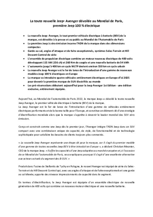 La nouvelle Jeep Avenger, le tout premier véhicule électrique à batterie (BEV) de la marque, est dévoilée à la presse et au public au Mondial de l’Automobile de Paris. La première Jeep à zéro émission incarne l’ADN de la marque dans des dimensions compactes. Garde au sol, angles d’attaque et de fuite exceptionnels, systèmes Selec-Terrain et Hill Descent Control de série.