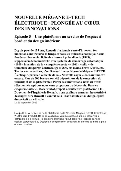 Depuis près de 125 ans, Renault n’a jamais cessé d’innover. Ses inventions ont traversé le temps et nous les utilisons chaque jour sans forcément le savoir. Boîte de vitesses à prise directe (1899), suppression de la manivelle avec système de démarrage automatique (1909), invention de la « cinquième porte » (1961), « plip » de fermeture des portes à infrarouge (1983), clé mains-libres (2000), etc. Toutes ces inventions, c’est Renault !