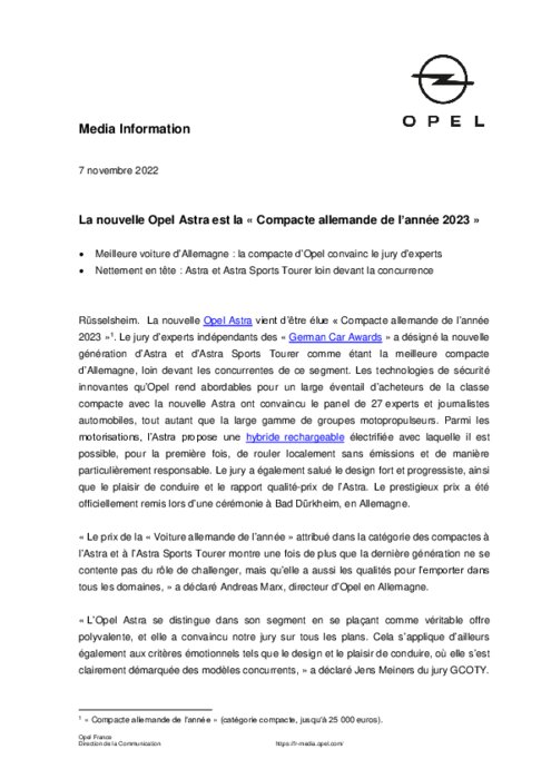 La nouvelle Opel Astra vient d’être élue « Compacte allemande de l’année 2023 »1. Le jury d’experts indépendants des « German Car Awards » a désigné la nouvelle génération d’Astra et d’Astra Sports Tourer comme étant la meilleure compacte d’Allemagne, loin devant les concurrentes de ce segment. Les technologies de sécurité innovantes qu’Opel rend abordables pour un large éventail d’acheteurs de la classe compacte avec la nouvelle Astra ont convaincu le panel de 27 experts et journalistes.