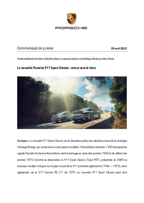 La nouvelle 911 Sport Classic est la deuxième pièce de collection issue de la stratégie Heritage Design, qui comptera au total quatre modèles. Cette édition limitée à 1 250 exemplaires signée Porsche Exclusive Manufaktur rend hommage au style des années 1960 et du début des années 1970. Comme sa devancière, la 911 Sport Classic (Type 997), présentée en 2009 ce nouveau modèle s’inspire sur le plan visuel de la 911 première génération (1964 – 1973).