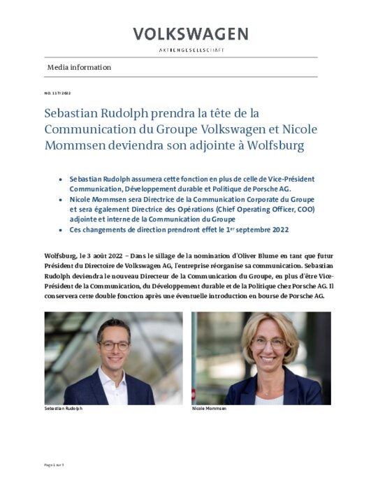 Dans le sillage de la nomination d'Oliver Blume en tant que futur Président du Directoire de Volkswagen AG, l'entreprise réorganise sa communication. Sebastian Rudolph deviendra le nouveau Directeur de la Communication du Groupe, en plus d'être Vice-Président de la Communication, du Développement durable et de la Politique chez Porsche AG. Il conservera cette double fonction après une éventuelle introduction en bourse de Porsche AG.