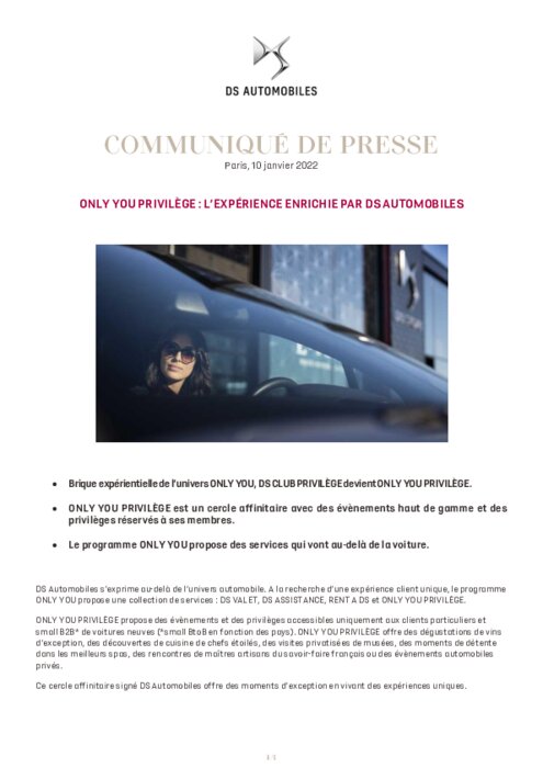 DS Automobiles s’exprime au-delà de l’univers automobile. A la recherche d’une expérience client unique, le programme ONLY YOU propose une collection de services : DS VALET, DS ASSISTANCE, RENT A DS et ONLY YOU PRIVILÈGE. ONLY YOU PRIVILÈGE propose des évènements et des privilèges accessibles uniquement aux clients particuliers et small B2B* de voitures neuves (*small BtoB en fonction des pays). ONLY YOU PRIVILÈGE offre des dégustations de vins d’exception, des découvertes de cuisine de chefs...