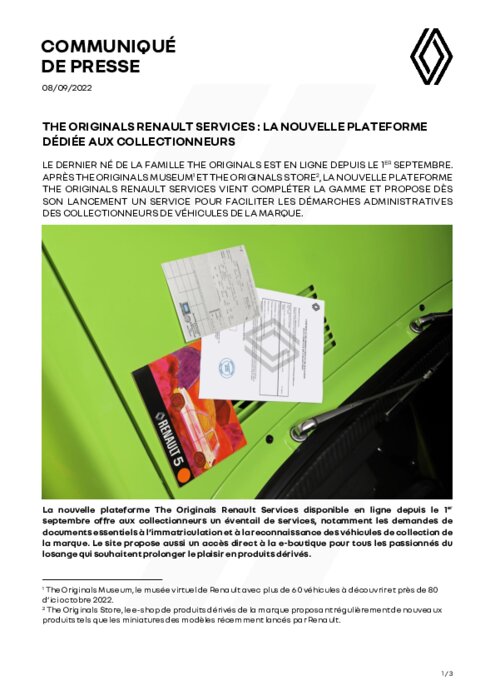 Le dernier né de la famille The Originals est en ligne depuis le 1er septembre. Après The Originals Museum et The Originals Store, la nouvelle plateforme The Originals Renault Services vient compléter la gamme et propose dès son lancement un service pour faciliter les démarches administratives des collectionneurs de véhicules de la marque.