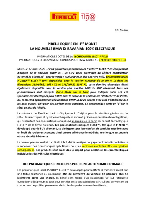 Pirelli fournit les pneumatiques P ZERO ELECT en équipement d'origine de la nouvelle BMW iX - un SUV 100% électrique du célèbre constructeur automobile allemand - pour la version xDrive50 et la plus sportive M60. Les pneumatiques P ZERO ELECT sont disponibles pour la version xDrive50 de la BMW iX dans les dimensions 255/50R21 109Y XL et 275/40R22 107Y XL, cette dernière dimension étant également disponible pour la version plus sportive M60 du SUV allemand...