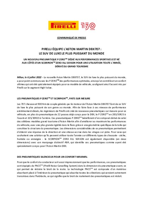 La nouvelle Aston Martin DBX707, le SUV de luxe le plus puissant du monde, a pour point commun avec les P ZEROTM des performances optimales, ainsi qu'un contrôle et un confort ultimes qui ont été spécialement équipés pour ce modèle de véhicule, soulignant ainsi l'accent mis par Pirelli sur le segment High Value.