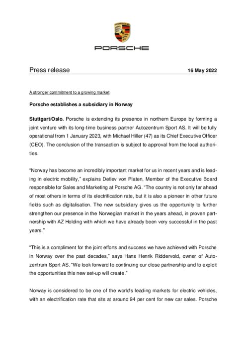 Porsche étend sa présence en Europe du Nord en créant une coentreprise avec son partenaire de longue date, Autozentrum Sport AS. Cette entreprise sera pleinement opérationnelle à partir du 1er janvier 2023. Michael Hiller en sera le président-directeur général (CEO). La conclusion de la transaction est soumise à l'approbation des autorités locales.