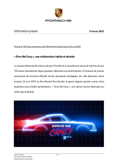 Enfin, pour les adeptes d’exclusivités, Porsche présente en avant-première mondiale dans cet espace plusieurs éléments de son univers. Tout d’abord, les produits Porsche Lifestyle de la collection 2.7 RS y sont dévoilés : maroquinerie, textiles, miniatures et œuvres uniques. Ensuite, Porsche a développé en exclusivité pour cette collaboration une collection capsule « Drive Me Crazy ». Celle-ci est composée de produits inspirés des stations-service - planches d’autocollants, gourdes, des casquettes, mugs - mais également d’une collection de vêtements pour enfant, femme et homme. Ces produits sont disponibles à la vente en quantité limitée uniquement pendant la durée de cette collaboration. Enfin, Porsche expose sur place sa nouvelle gamme 2022 de vélos électriques, les eBikes Cross et Sport, disponibles à compter du dernier trimestre de cette année. Pour l’occasion, une dizaine d’exemplaires sont proposés en précommande.