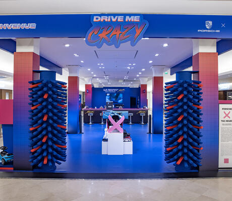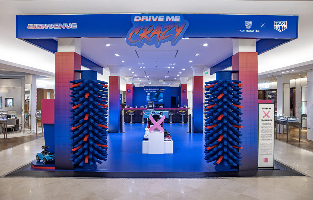 Installé au rez-de-chaussée de l’historique magasin parisien, vous ne trouverez aucun effluve d’essence dans l’espace « Drive Me Crazy » mais un lieu expérientiel et lifestyle revisitant les codes de la station-service... en version électrique. Depuis l’entrée par les immenses rouleaux inspirés des « car wash » jusqu’aux vitrines reprenant le design des pompes à essence vintage, la scénographie a été pensée pour offrir aux visiteurs une expérience immersive, mémorable et surprenante. Durant toute la durée de l’évènement, une programmation riche, créative et émotionnelle, sera proposée pour permettre à toute la famille d’explorer les univers de Porsche et de TAG Heuer à travers leur passion commune pour le sport automobile, le design et le luxe.