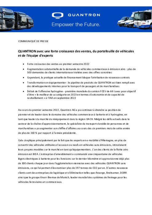 Au cours du premier semestre 2022, Quantron AG a pu continuer à étendre sa position de pionnier et de leader dans le domaine des véhicules commerciaux à batterie et à hydrogène, en tant que leader du marché du rééquipement dans la région DACH. Malgré les défis actuels dans le secteur de la chaîne d'approvisionnement, le spécialiste du transport durable de personnes et de marchandises a pu augmenter son chiffre d'affaires au cours des six premiers mois de cette année.