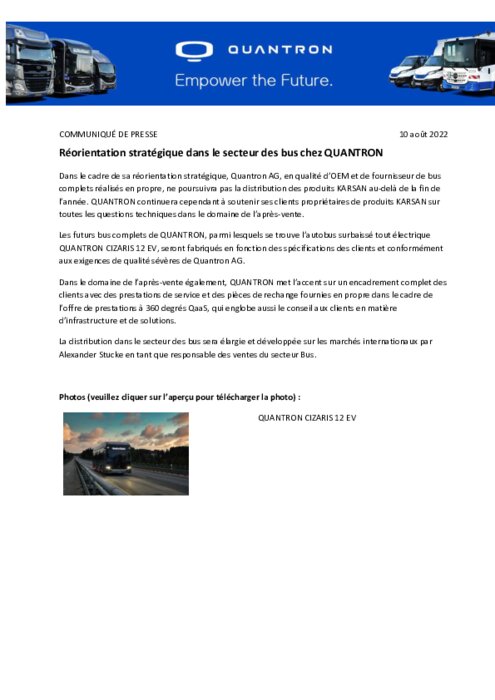 Dans le cadre de sa réorientation stratégique, Quantron AG, en qualité d’OEM et de fournisseur de bus complets réalisés en propre, ne poursuivra pas la distribution des produits KARSAN au-delà de la fin de l’année. QUANTRON continuera cependant à soutenir ses clients propriétaires de produits KARSAN sur toutes les questions techniques dans le domaine de l’après-vente.