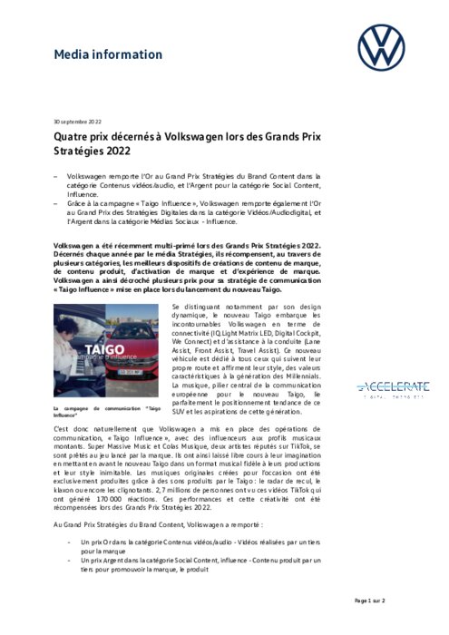 Volkswagen a été récemment multi-primé lors des Grands Prix Stratégies 2022. Décernés chaque année par le média Stratégies, ils récompensent, au travers de plusieurs catégories, les meilleurs dispositifs de créations de contenu de marque, de contenu produit, d’activation de marque et d’expérience de marque. Volkswagen a ainsi décroché plusieurs prix pour sa stratégie de communication « Taigo Influence » mise en place lors du lancement du nouveau Taigo.