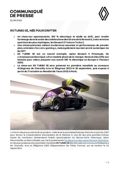 « Une année pop et pleine de surprises » : telle était la promesse faite par Renault en janvier 2022 pour lancer le cinquantième anniversaire de la Renault 5, une de ses plus grandes icônes. Après de nombreux événements festifs (participation au Monte-Carlo historique, salon Rétromobile, Le Mans Classic, etc.) et la présentation du show-car électrique Renault 5 Diamant, la marque présentera en première mondiale R5 TURBO 3E dans le cadre du concours d’élégance de Chantilly Arts et Élégance 2022.