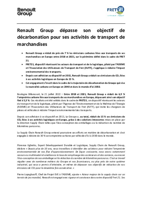 Entre 2018 et 2021, Renault Group a réduit de 6,9 % l’empreinte carbone liée aux transports de ses marchandises en Europe, dépassant ainsi son objectif fixé à 5,3 %. Ces résultats ont été validés dans le cadre de FRET21, un dispositif réunissant les acteurs du transport et de la logistique, qui incite les chargeurs de pièces et véhicules à réduire l'impact environnemental des transports.