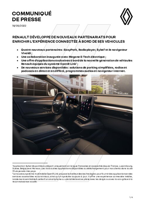 Quatre nouveaux partenaires : EasyPark, Radioplayer, Sybel1 et le navigateur Vivaldi. Une collaboration inaugurée avec Megane E-Tech électrique. Une offre d’applications exclusives à bord de la nouvelle génération de véhicules Renault équipés du système OpenR Link2. De nouveaux services disponibles : solutions de parking simplifiées, radios et podcasts en direct et en différé, programmes audios et navigateur internet.